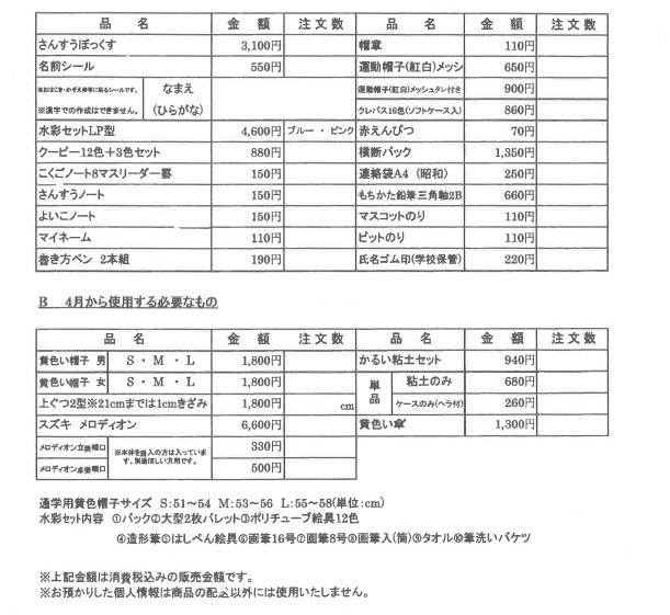 新入児学用品値段表